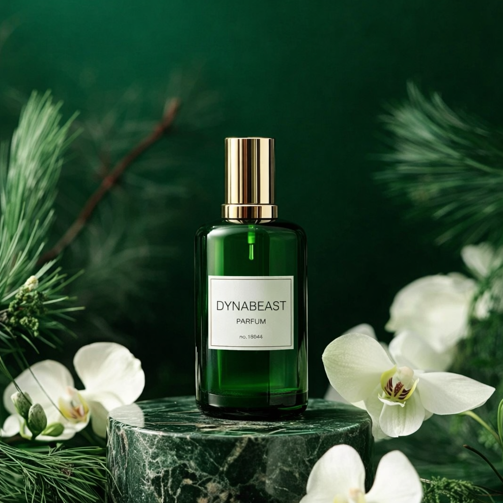 A luxury dark green perfume bottle with gold cap, placed on a round green marble pedestal. White orchid flowers and pine leaves surround the bottle, creating a fresh, forest-inspired feel. Deep green background with soft gradients and subtle blur. Elegant studi lighting highlights the glass and gold details, with soft shadows and realistic reflections. Calm, premium fragrance advertisement style with a natural yet sophisticated mood. Aspect Ratio: 4:5 Style: realistic, luxury perfume product photography