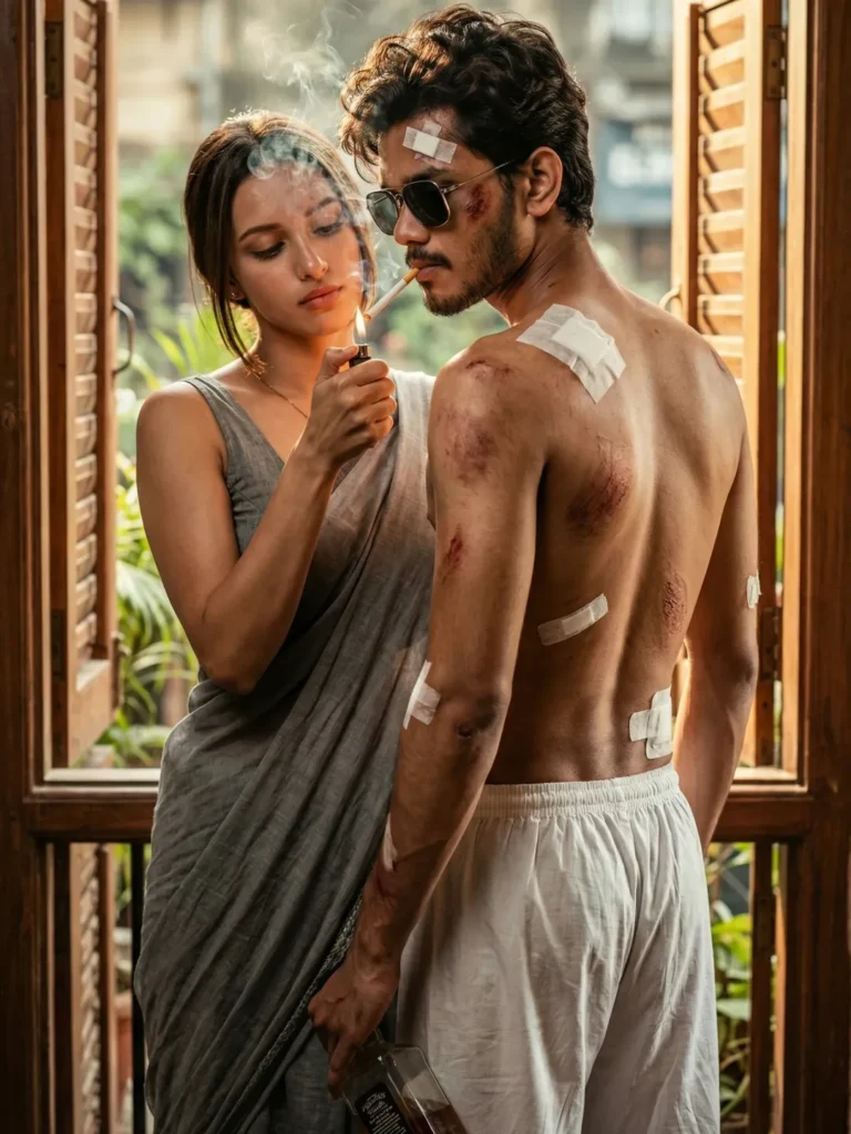 The boy has medium-length wavy hair, slightly messy and rugged. A small white bandage mark is placed on his forehead. His expression is calm yet intense, eyes lowered with controlled emotion. Behind him stands a young Indian woman (reference- uploaded photo), close and intimate, wearing a soft grey sleeveless sari, minimal makeup, tied hair, and gold bangles. She is gently lighting a cigarette near the boy's lips using a lighter, her face calm, focused, and emotionally connected. The scene is set inside a wooden room with open window shutters, allowing natural daylight to enter. Outside the window, green plants and soft urban background are visible. Warm sunlight highlights